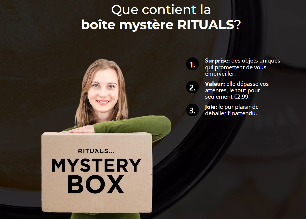 Je suis tellement contente de mon achat. Une Rituals Mystery Box prestigieuse avec une réduction que je n'aurais jamais imaginée.